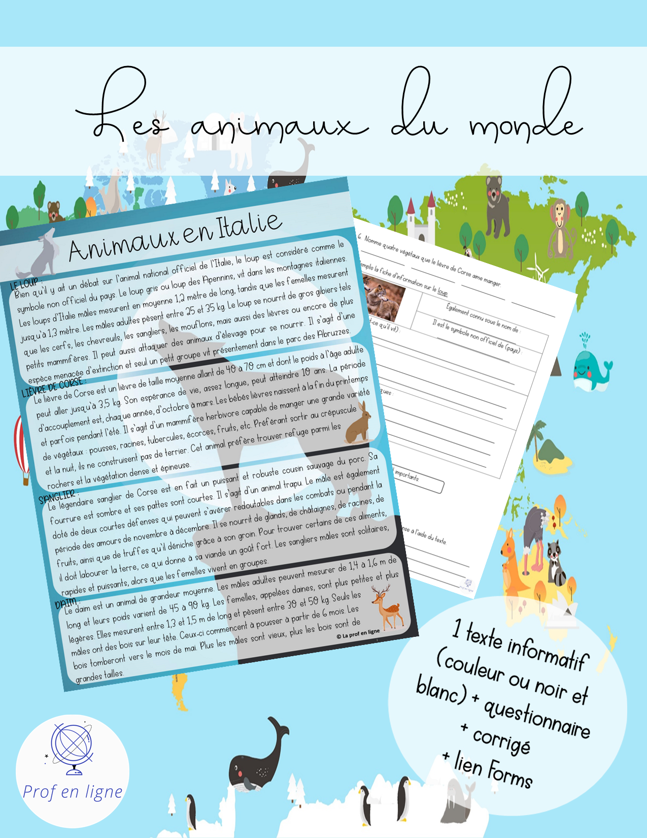 Voici une petite compréhension de lecture portant sur 4 animaux que l’on retrouve en Italie. Elle convient surtout aux élèves du 2e cycle.
