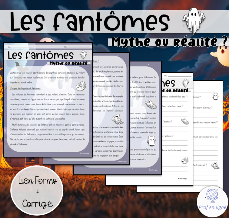 Voici une compréhension de lecture portant sur les fantômes. Idéale pour le 2e et 3e cycle, cette compréhension permet de mieux comprendre les superstitions entourant les fantômes, tout en faisant un survol des raisons poussant des personnes à croire aux fantômes, ainsi que du fantôme de la Dame Blanche. Finalement, le texte fait un bref survol des croyances liées aux fantômes des animaux.