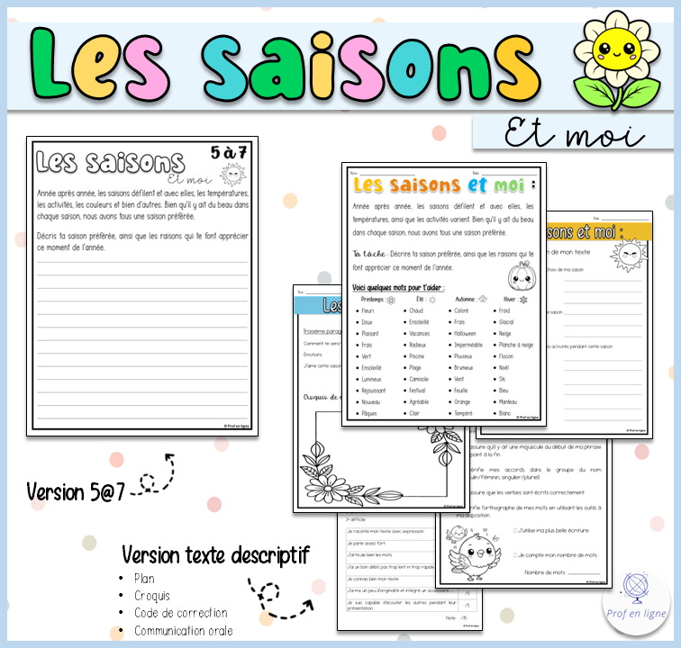 - Un écrit, ma saison préférée, disponible en 2 versions : 5@7 ou texte descriptif