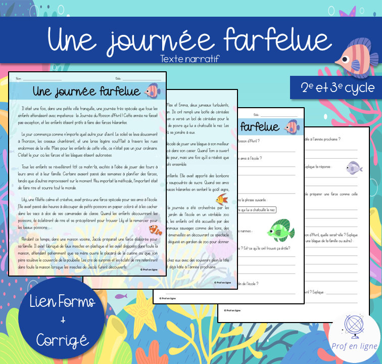 Voici une compréhension de lecture (texte narratif) portant sur une série de farces et attrapes organisées par des enfants et des enseignants(es), lors de la journée du « Poisson d’avril ». Idéal pour les élèves de 3e à 5e année.